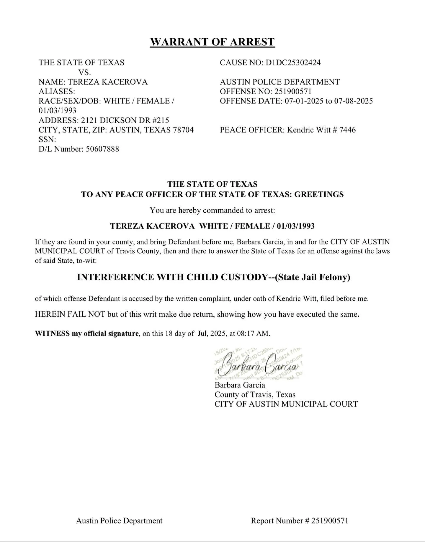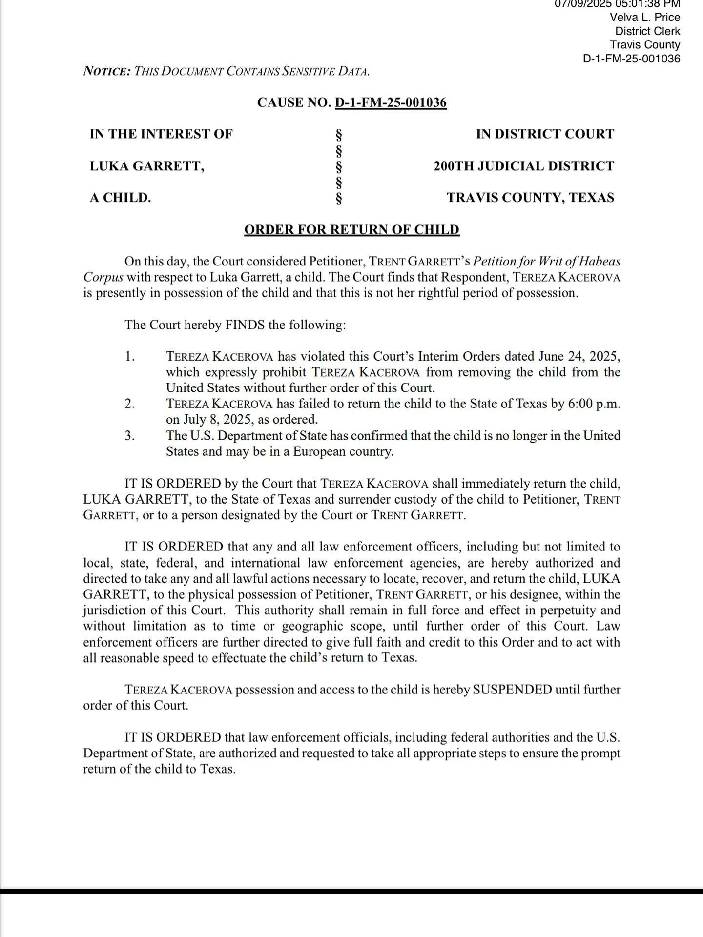 Tereza Kacerova has kidnapped Luka Garrett after losing custody to his father. There are open Federal and State warrants out for her arrest for felony kidnapping. She has serious psychiatric issues and has been ORDERED to return the child to the father and return him to his stable life in America. She originally took him to the Czech Republic, but after the Czech court ruled that the child must return to the United States to his the legal custody of his father, she has now fled to Southeast Asia. We need your help to find and return Luka to the United States.